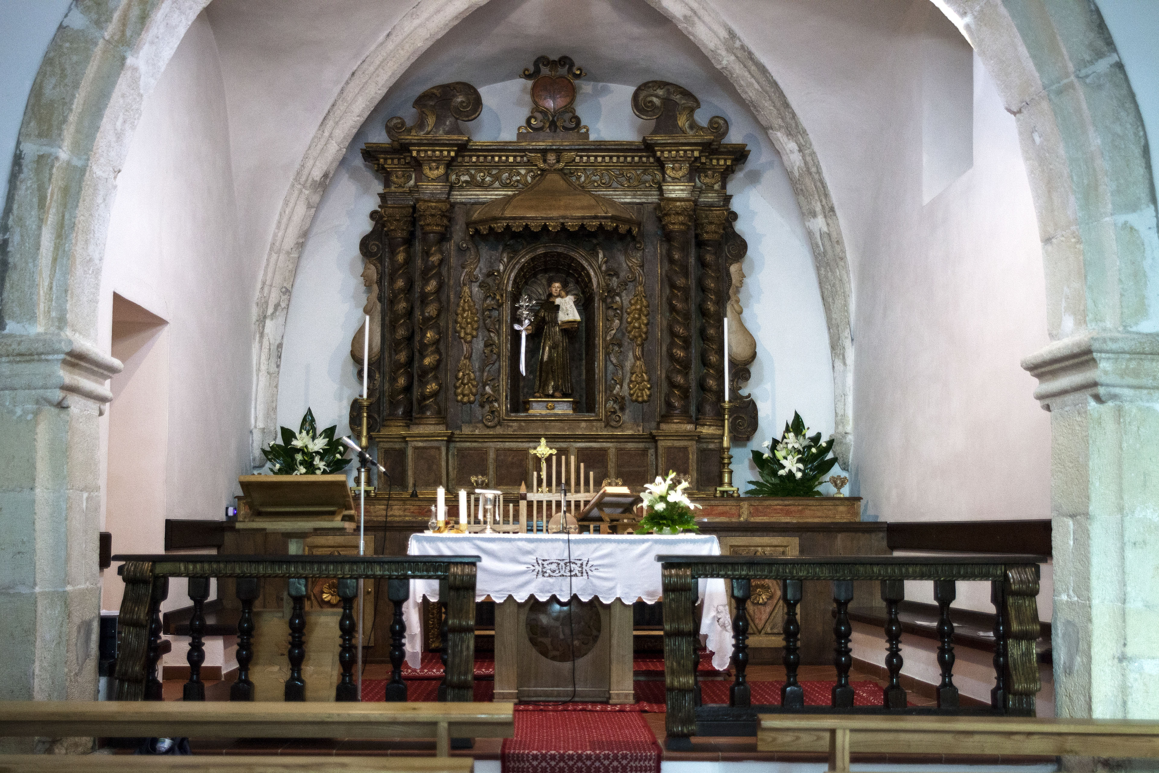 All’interno si conserva un’atmosfera raccolta: la copertura lignea è sostenuta da pilastri e archi ogivali in pietra a vista, mentre le pareti, intonacate e bianche, sono prive di decorazioni. L’ampio presbiterio, rialzato di tre gradini e voltato a crociera con costoloni lapidei, custodisce un pregevole altare ligneo barocco del 1734-1736, mentre lungo la navata si aprono due nicchie lignee seicentesche.